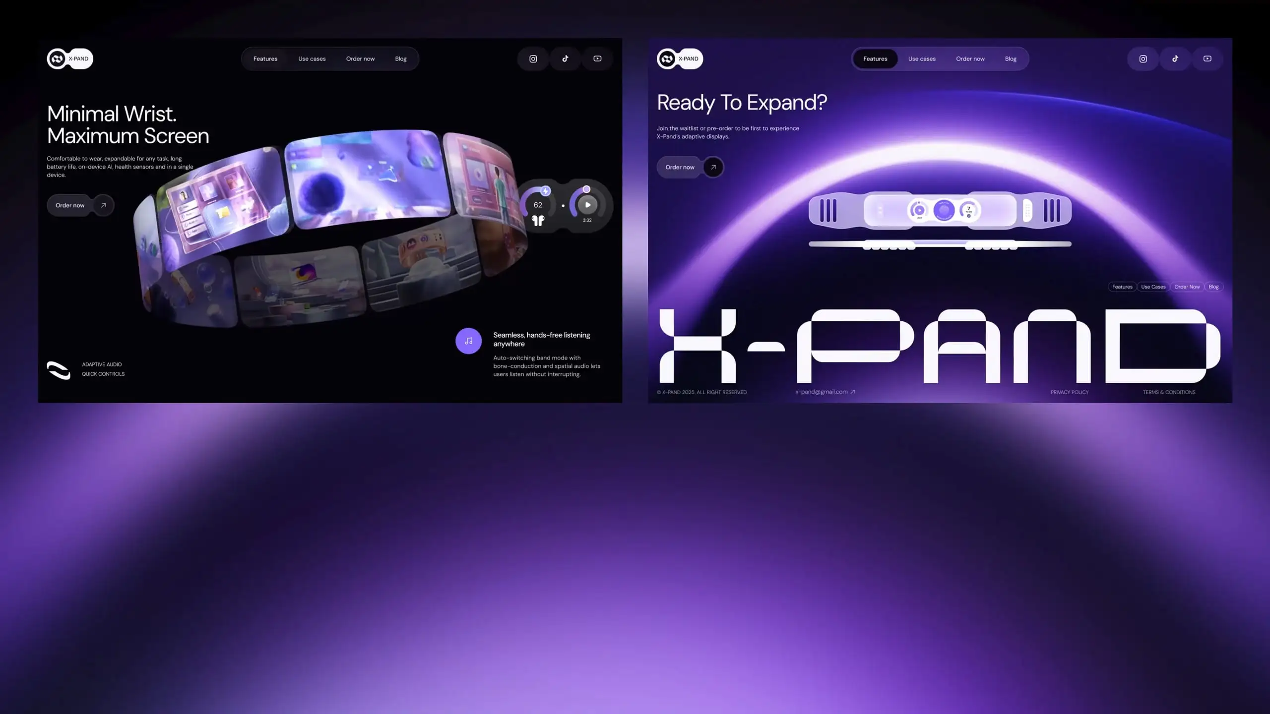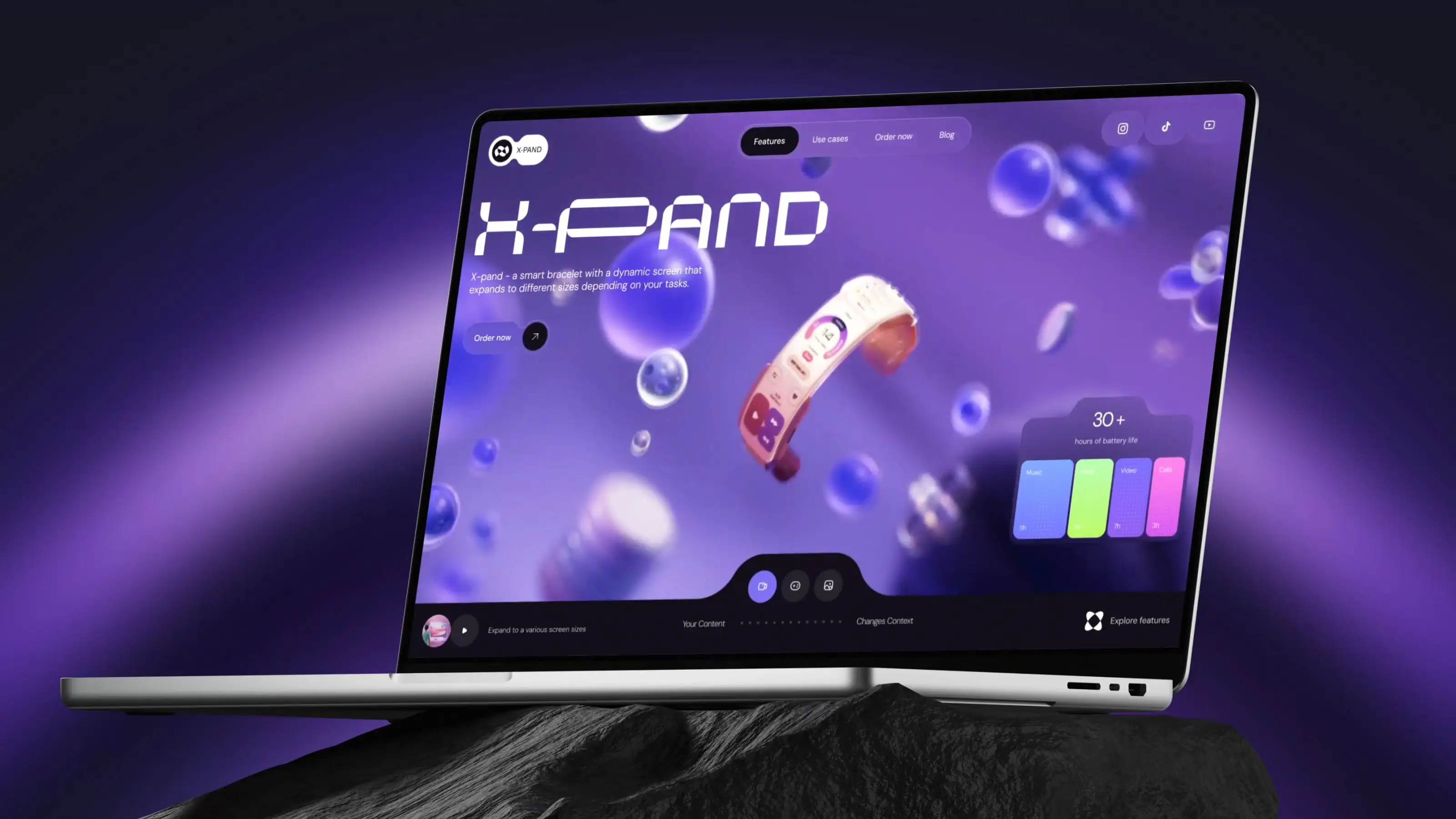 I designed a motion led website for X-Pand that greets visitors with a cinematic hero showing the bracelet smoothly expanding. The site then gently guides people through the product’s core features and short real world use cases, each paired with 3D scenes. Subtle animations echo the device’s expanding behavior so the experience feels tangible, and the layout reveals information as you scroll so visitors can quickly understand what X-Pand does.